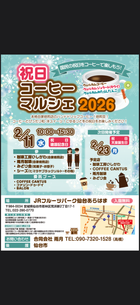 第2回祝日コーヒーマルシェ開催のお知らせ2026.02.02 Tweet Share2月11日(水)10時~15時30分JRフルーツパーク仙台あらはま(研修棟)開催いたします。よろしくお願いいたします。*東北の冬季的な事情もあり第1回開催時に案内しました第2回開催の内容と変更がございます。大変申し訳ございませんがご了承ください。 2026年1月12日祝日コーヒーマルシェ御礼前の記事